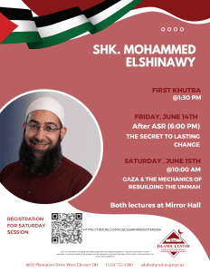 On Saturday (Day of Arfah), Sheikh ElShinawy will delve into the topic of ‘Gaza & the Mechanics of Rebuilding the Ummah.’